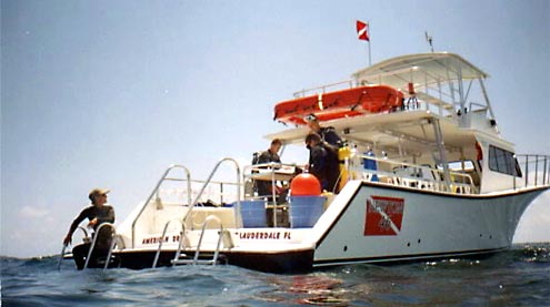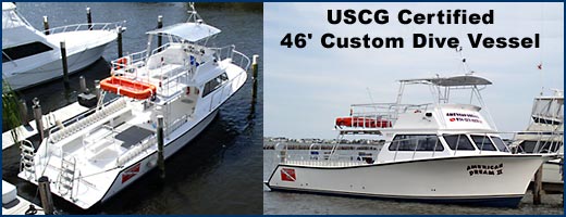 is a USCG certified 46' custom-built dive vessel. She is both roomy and comfortable, boasting over 400 Sq. Ft. of deck space, complete with upper level seating. Her 16' beam adds to her spaciousness and stability.